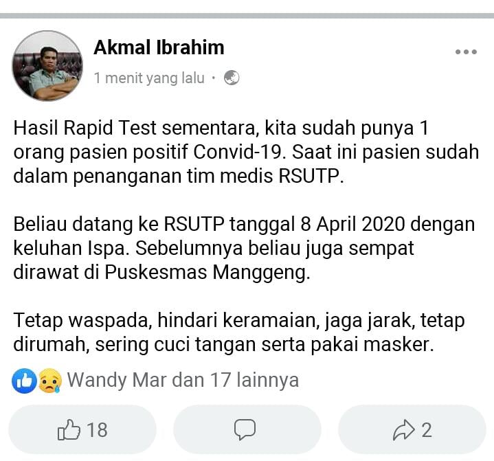 Dalam postingan itu, Akmal menyebutkan bahwa saat ini pasien sudah dalam penanganan medis di Rumah Sakit Teungku Peukan (RSUTP) Abdya.