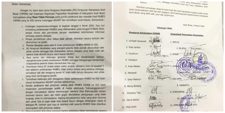“Kami dari sebelas kecamatan sepakat untuk menolak dan mengajukan mosi tidak percaya terhadap hasil MUBES HIMAB Ke XII kepengurusan 2020-2022” kata Ketua Ikatan Mahasiswa Pemuda dan Pelajar Montasik, Ikhwan Zuhdi pada Minggu (15/3/2020).
