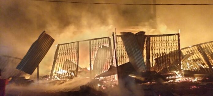 Analisaaceh.com, Suka Makmue | Sebanyak 12 unit rumah toko (Ruko) di Pasar Induk, Simpang Peut Kecamatan Kuala, Kabupaten Nagan Raya, hangus terbakar pada Selasa (20/12/202) pagi.