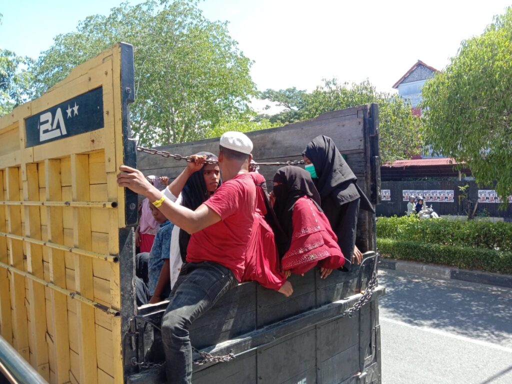 Amatan di lapangan , rombongan yang terdiri dari ibu-ibu, anak-anak, dan pria dewasa ini diangkut menggunakan lima dump truck, dengan pengawalan mobil Satpol PP Aceh Selatan.
