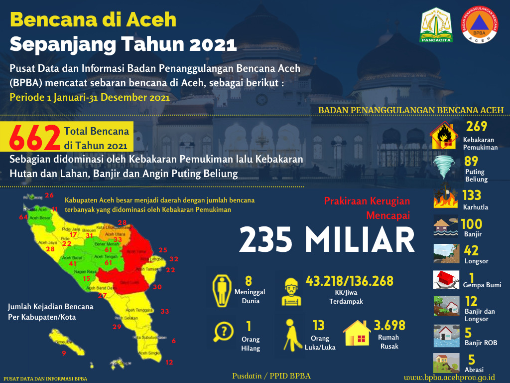 Analisaaceh.com, Banda Aceh | Badan Penanggulangan Bencana Aceh (BPBA) mencatat, 662 kejadian bencana terjadi di Aceh sejak Januari hingga 31 Desember 2021. Total kerugian diperkirakan mencapai Rp.235 miliar.