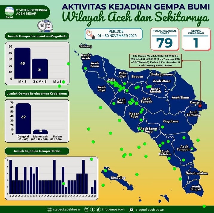Analisaaceh.com, Aceh Besar | BMKG Stasiun Geofisika Aceh Besar mencatat 79 gempa bumi mengguncang wilayah Aceh sepanjang November 2024.