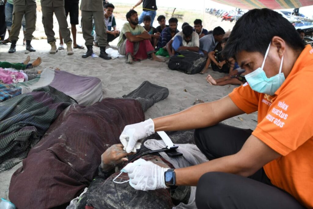 Tim INAFIS Polres Aceh Timur melakukan identifikasi terhadap warga Rohingya yang ditemukan meninggal dunia. Foto (dok. Polres Aceh Timur).