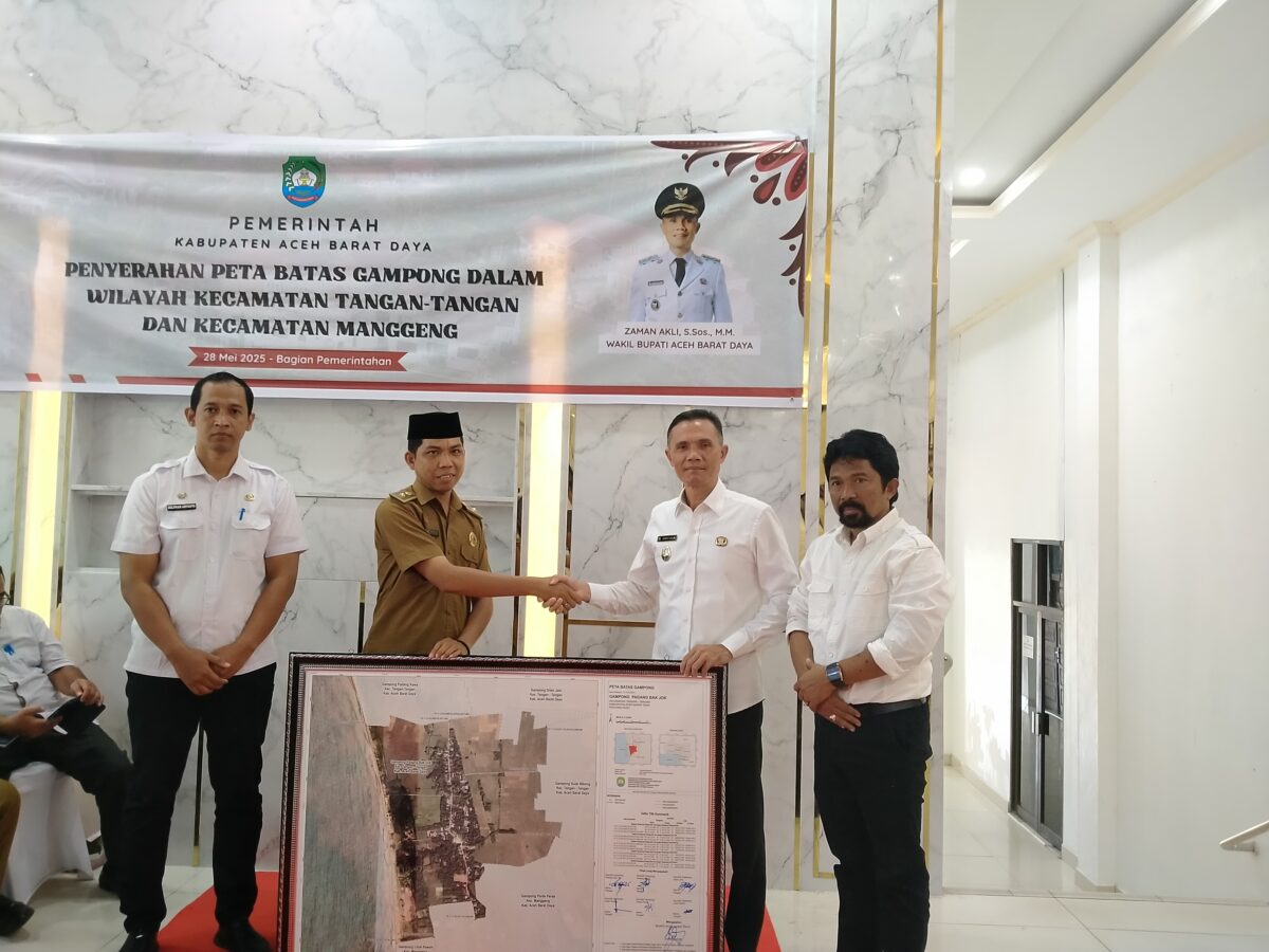 Penyerahan Peta batas desa itu diserahkan langsung oleh Wakil Bupati Abdya Zaman Akli disaksikan Sekda Abdya, Rahwadi, Plt Asisten III Setdakab Abdya, Rizal, unsur Forkompinkab dan pejabat terkait lainnya yang berlangsung di Lobi Kantor Bupati Abdya, Rabu (28/5/2025).