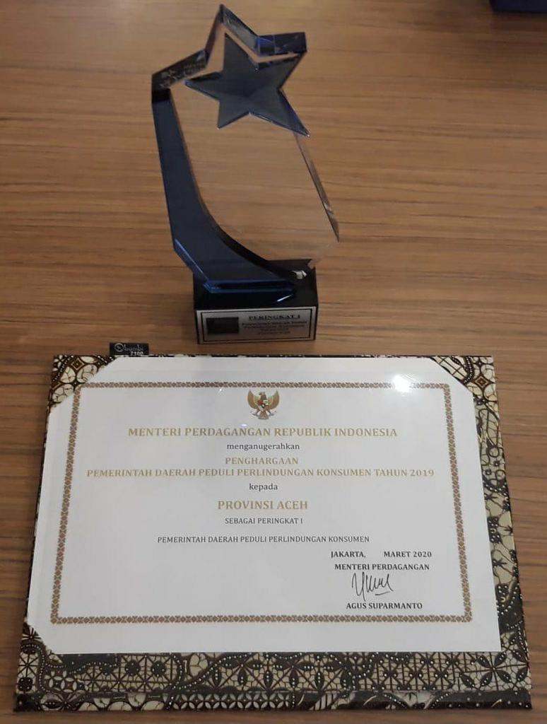 Penghargaan itu diterima langsung Kepala Dinas Perindustrian dan Perdagangan Aceh pada puncak acara Hari Konsumen Nasional (Harkonas) di Cibubur, Kamis (12/11) kemarin.
