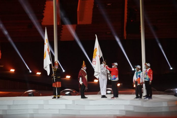 Sebelumnya, Gubernur Papua, Lukas Enembe, menyerahkan bendera PON kepada Ketua Umum KONI Pusat, Marciano Norman.