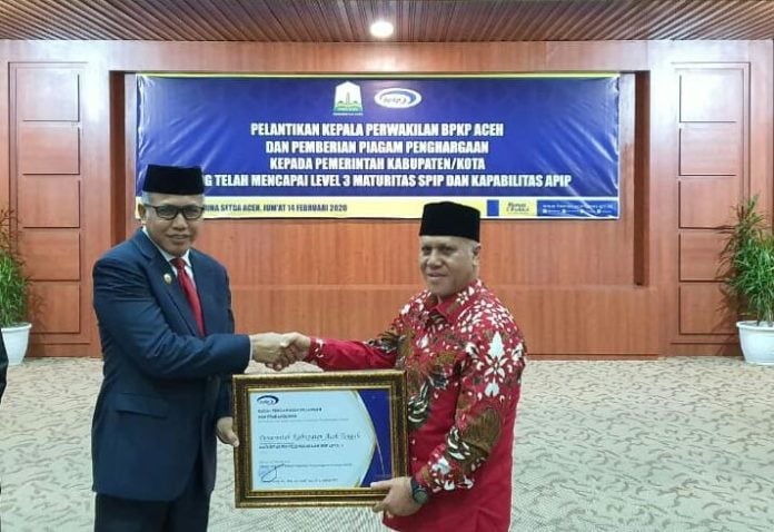 Penghargaan ini diserahkan disela-sela pelantikan dan serah terima jabatan Kepala Perwakilan Badan Pengawasan Keuangan dan Pembangunan (BPKP) Aceh di Gedung Serba Guna Kantor Gubernur, Jum’at (14/02/2020).
