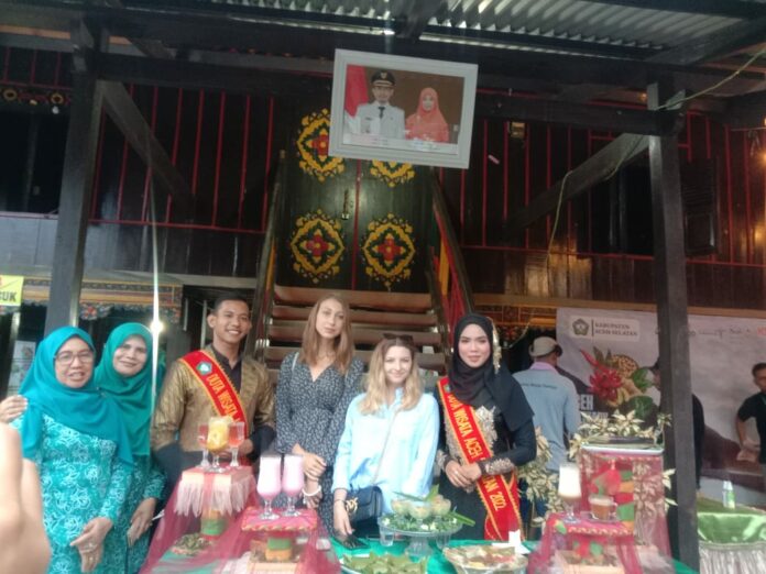 Duta wisata Aceh Selatan, Bambang Lesmana dan Salsabila juga menjelaskan kepada dua warga Polandia tersebut terkait kuliner yang ditampikan dalam pameran, salah satunya Subang Gadeng yang merupakan makanan khas raja zaman dulu.