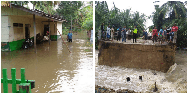 ANALISAACEH.COM, PIDIE JAYA | Hujan deras yang mengguyur Kabupaten Pidie Jaya sejak sabtu (01/02/2020) malan menyebabkan beberapa beberapa Gampong di Kecamatan Meureudu dan Ulim digenangi banjir. Selain itu juga menyebabkan jembatan putus.