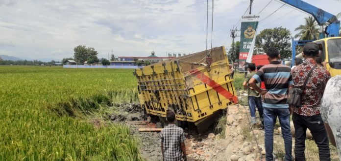 “Laka lantas tunggal ini karena sopir mengantuk sehingga truck hilang kendali dan jatuh di sawah warga,” jelas Ading.