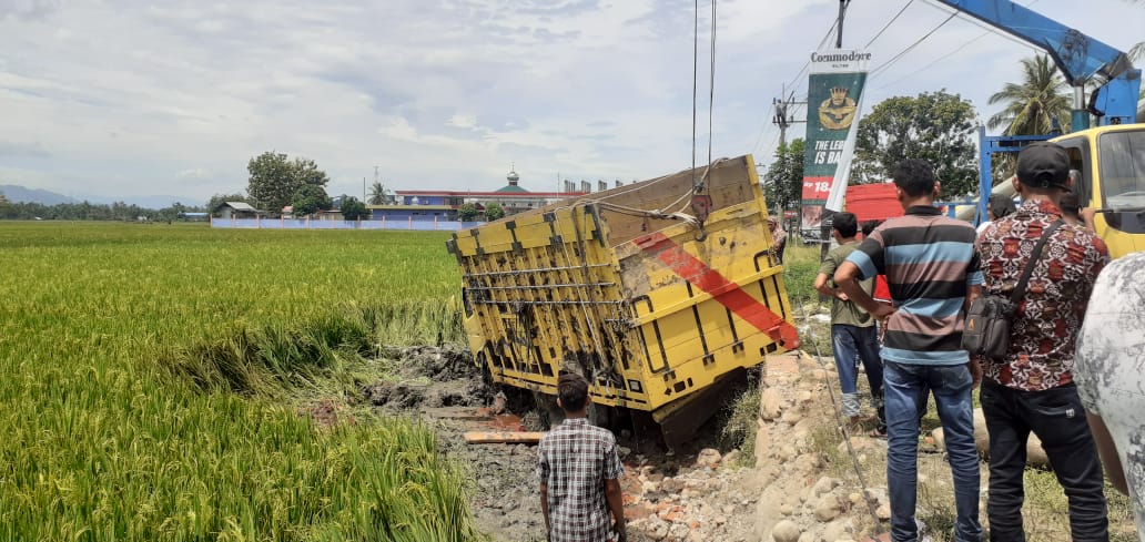 Analisaaceh.com, Meureudu | Sebuah truk jenis Mobar Light terjun ke sawah di Jalan Medan – Banda Aceh, Gampong Paya Seutui Kecamatan Ulim Pidie Jaya, Minggu, (18/10/2020).