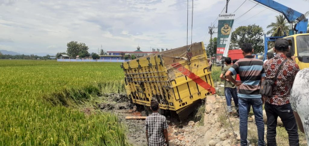 Analisaaceh.com, Meureudu | Sebuah truk jenis Mobar Light terjun ke sawah di Jalan Medan – Banda Aceh, Gampong Paya Seutui Kecamatan Ulim Pidie Jaya, Minggu, (18/10/2020).