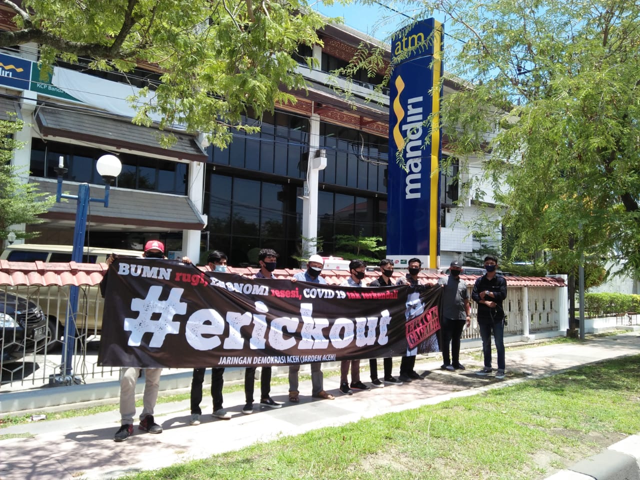 Dalam aksi ini terihat para pengunjuk rasa membawa spanduk yang bertuliskan #ErickOut di kantor asuransi milik BUMN, yakni JiwaSraya cabang Banda Aceh di Jalan Teungku Chik Ditiro. Setelah berorasi di kantor tersebut, massa berpindah ke GraPari Telkomsel (anak BUMN Telkom), Kantor Pertamina Aceh, Kantor perwakilan Bank Mandiri Aceh dan kantor perwakilan PLN Aceh.