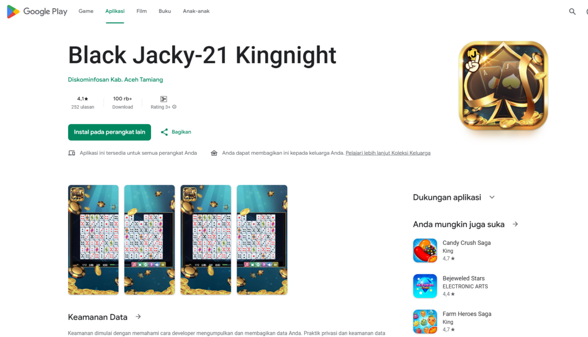 Berdasarkan penelusuran Analisaaceh.com, aplikasi yang diduga memiliki fitur permainan kartu domino tersebut tertera pada pilihan di google Play Store dengan nama Black Jacky-21 Kingnight yang dirilis pada 3 Januari 2025 dan ditawarkan oleh Diskominfosan Aceh Tamiang.