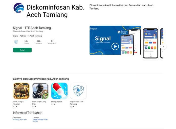 Selain dugaan aplikasi judol, akun google developer atas nama Kominfosan juga mengupload beberapa aplikasi lainnya seperti Signal – TTE Aceh Tamiang yang menawarkan fitur tanda tangan elektronik, paraf dokumen, scan keaslian dokumen dan lainnya, sehingga semakin menguatkan bahwa akun google developer itu benar milik Kominfosan Aceh Tamiang.