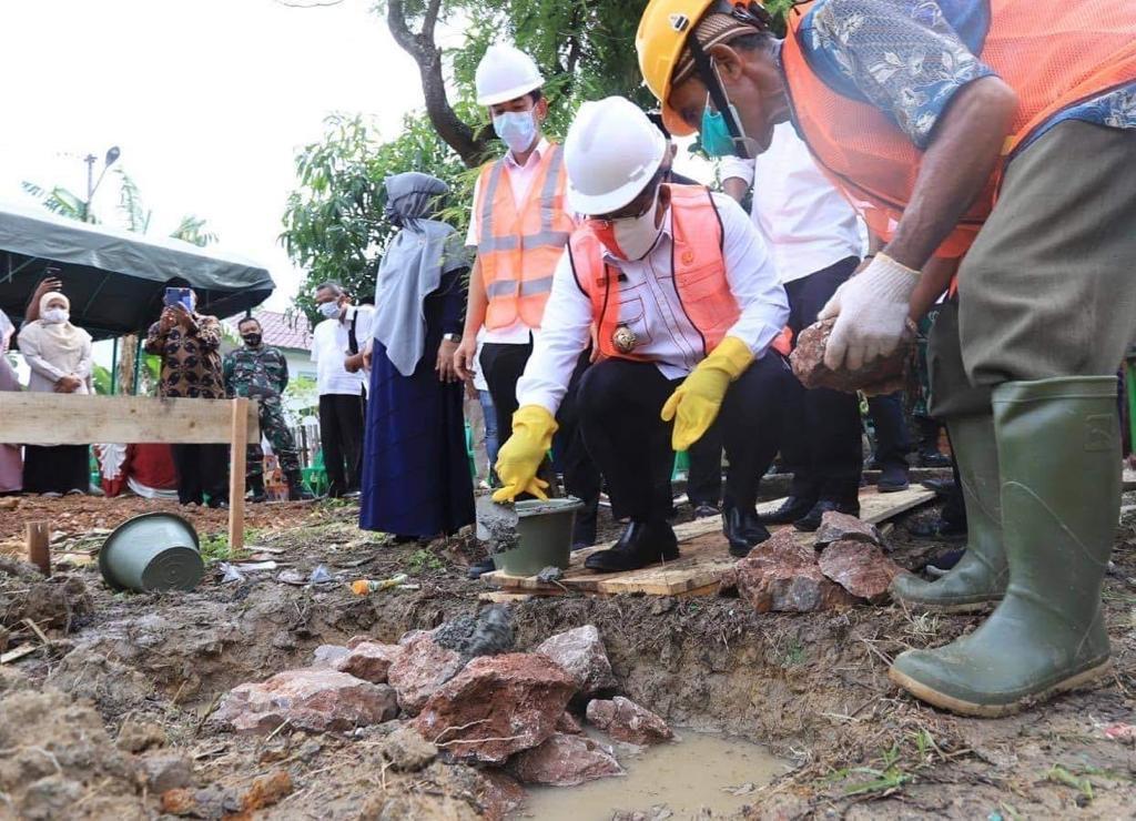 Analisaaceh.com, Banda Aceh | Wali Kota Banda Aceh, Aminullah Usman bersama Kepala Balai BPPW Aceh, M Yoza Habibi melakukan peletakan batu pertama rumah produksi sambal goreng kentang di Gampong Geuceu Meunara, Rabu (26/8).