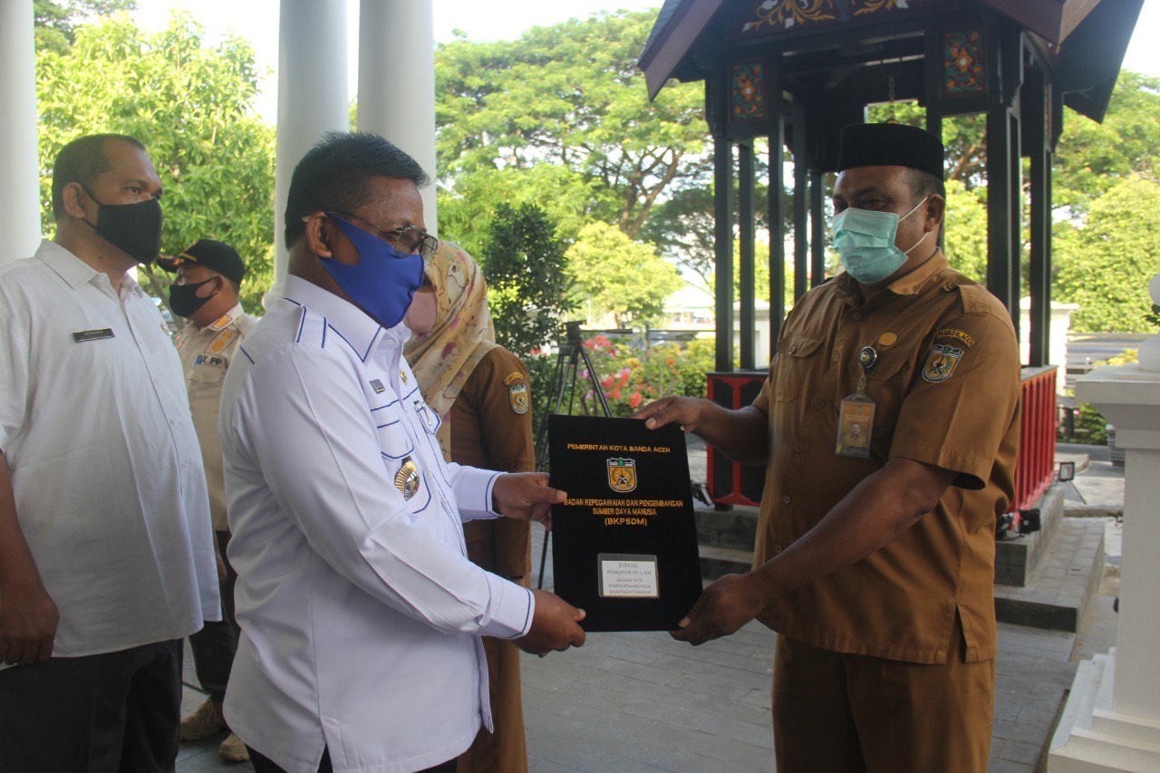 Analisaaceh.com, Banda Aceh | Wali Kota Banda Aceh, Aminullah Usman menyerahkan secara simbolis SK Kenaikan pangkat ASN TMT 01 Oktober 2020 Gol III/d ke bawah di lingkungan Pemerintah Kota Banda Aceh, Rabu (15/7/2020) di halaman Pendopo Wali Kota.
