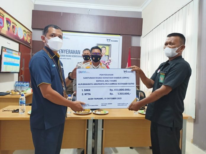 Santunan SRKK itu diserahkan pihak PT. ASABRI dan PT. Mandiri Taspen kepada ahli waris di Aula Vidcon Mapolres Aceh Tamiang pada Jum’at (1/10/21).