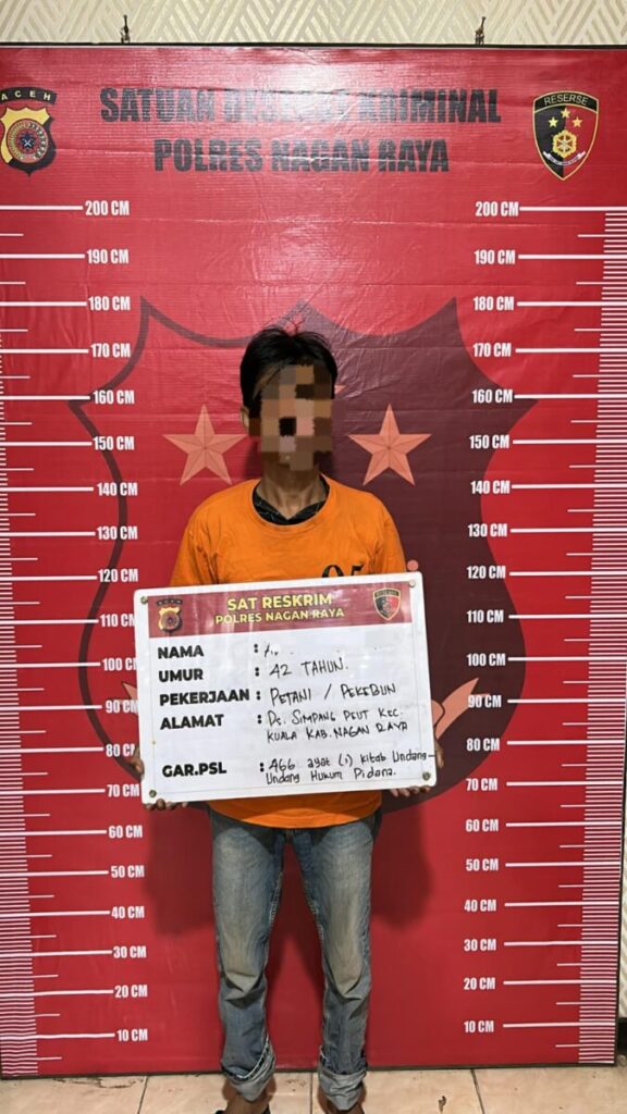 Analisaaceh.com, Suka Makmue | Seorang petani berinisial AB (42) warga Gampong Simpang Peut, Kecamatan Kuala, Kabupaten Nagan Raya ditangkap polisi karena diduga melakukan tindak pidana penganiayaan terhadap seorang ibu rumah tangga (IRT) berinisial S (42). Peristiwa penganiayaan itu terjadi di rumah korban di gampong Simpang Peut, Kecamatan Kuala pada Sabtu (1/11/2025) sekitar pukul 22.00 WIB.