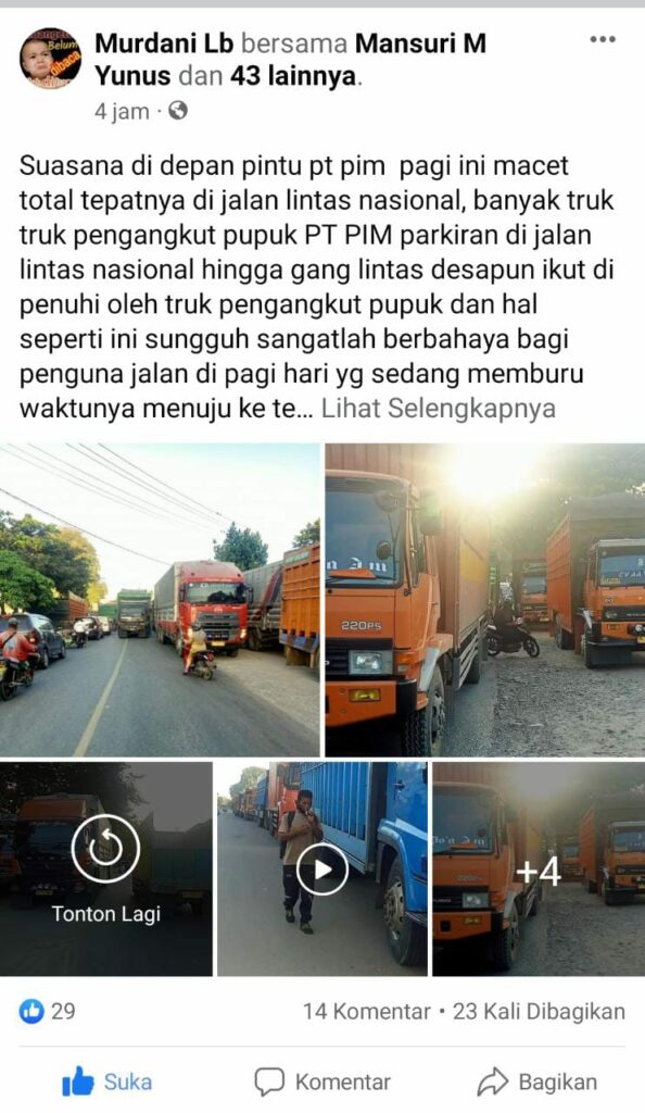 Murdani menulis “Suasana di depan pintu pt pim pagi ini macet total tepatnya di jalan lintas nasional, banyak truk truk pengangkut pupuk PT PIM parkiran di jalan lintas nasional hingga gang lintas desapun ikut di penuhi oleh truk pengangkut pupuk dan hal seperti ini sungguh sangatlah berbahaya bagi penguna jalan di pagi hari yg sedang memburu waktunya menuju ke tempat aktivitas”.