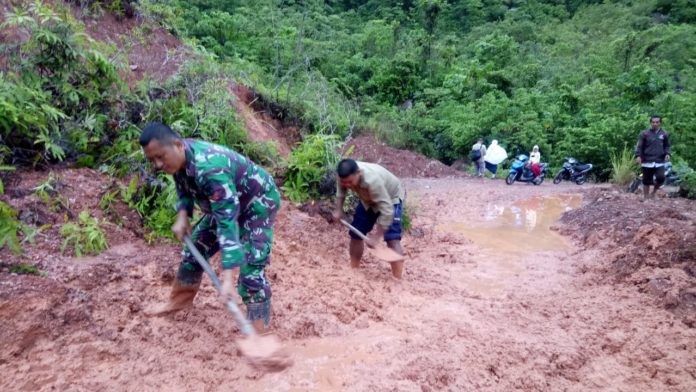 Babinsa Koramil 13/Kluet Timur Kodim 0107/Aceh Selatan bersama Bhabinkamtibmas Polsek Kluet Timur dan masyarakat sigap membersihkan material longsor yang menutup badan jalan tersebut.