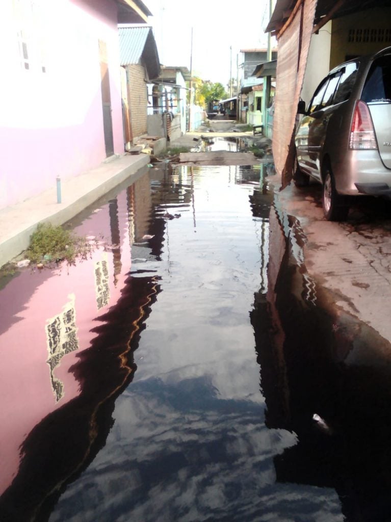 Sejumlah lokasi pemukiman warga pun terendam air Bahkan membuat kondisi badan jalan cepat rusak terkena air asin tersebut.