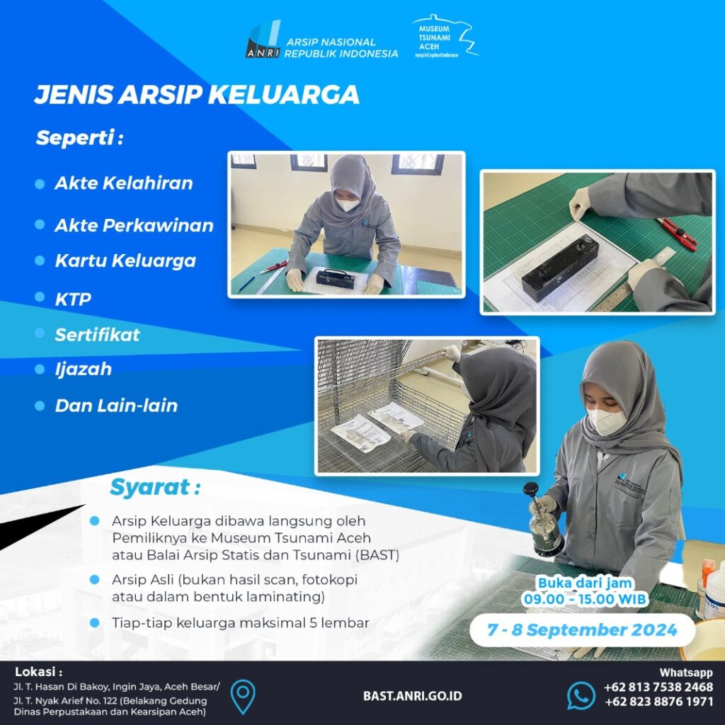 Analisaaceh.com, Banda Aceh | Dalam rangka memperingati 20 tahun Tsunami Aceh, Balai Arsip Statis dan Tsunami (BAST) bekerja sama dengan Museum Tsunami Aceh menghadirkan program Layanan Restorasi Arsip Keluarga (Laraska). Program ini bertujuan membantu masyarakat melestarikan arsip pribadi dan keluarga untuk meningkatkan ketahanan menghadapi bencana.