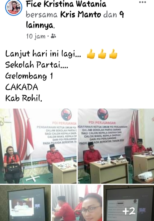 Dalam postingan di Facebook pribadinya Fice (begitu biasa dipanggil) menulis “Lanjut malam ini… Sekolah Partai… Gelombang 1 CAKADA Kab Rohil” terlihat dalam postingan beberapa foto diantaranya foto pasangan bacalon petahana Suyatno dan Jamiludin menghadap ke layar infocus dan foto Fice duduk berdampingan dengan bacalon petahana.