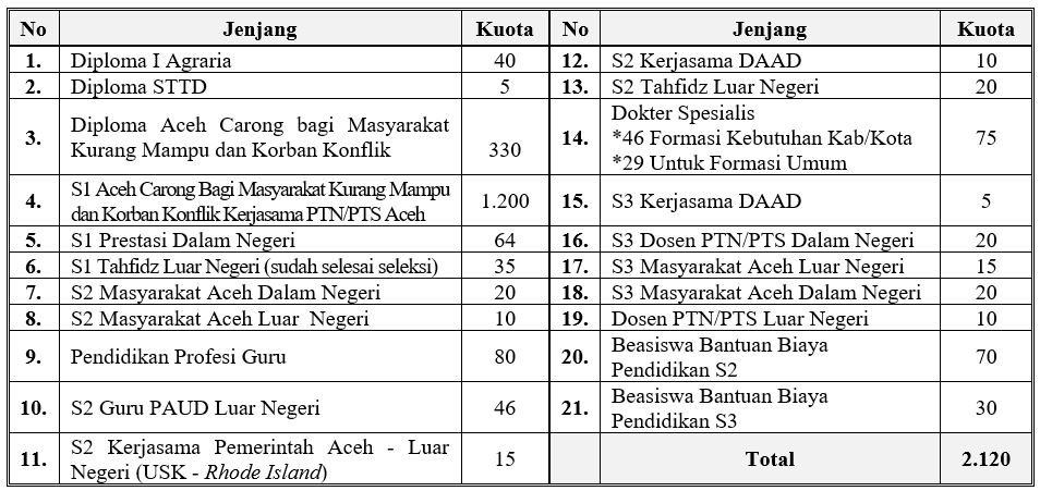 - BPSDM Aceh membuka pendaftaran dan seleksi beasiswa bagi masyarakat Aceh dengan kuota 2.120 (dua ribu seratus dua puluh orang) untuk jenjang berikut: