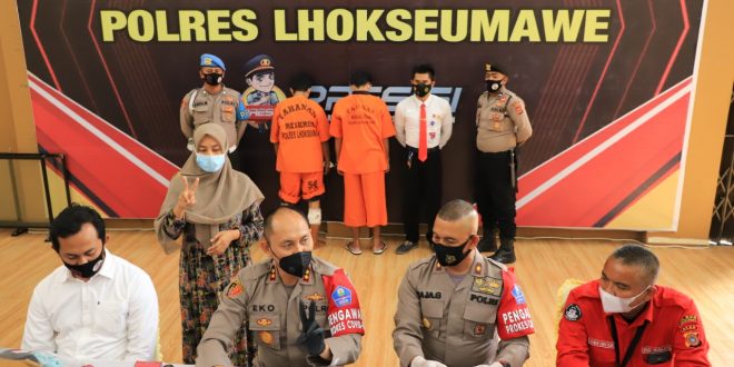 Kapolres Lhokseumawe AKBP Eko Hartanto SIK MH dalam konferensi pers di gedung serbaguna Wira Satya Mapolres Lhokseumawe, Senin (30/8/2021) mengatakan, kedua tersangka tersebut yaitu, MYS (29) warga Kabupaten Bireuen dan ND alias YN (42) warga Kecamatan Karimun, Kepulauan Riau.