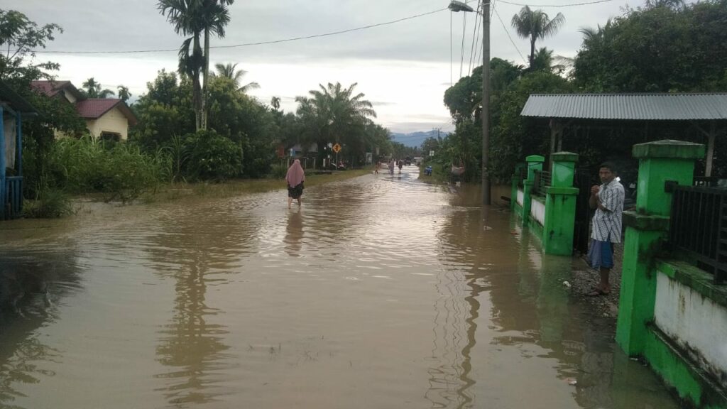 Banjir menggenangi badan jalan di Nagan Raya, Selasa (21/12/2021). Foto: Ist