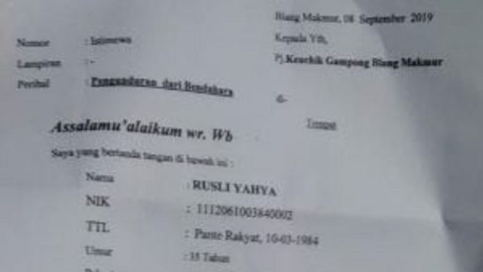 Pengunduran Rusli Yahya selaku Bendahara Desa setempat berdasarkan surat yang di tandandatanganinya di atas materi 6000 sebagaimana yang dilihat analisaaceh.com, Sabtu, (14/9/2019).