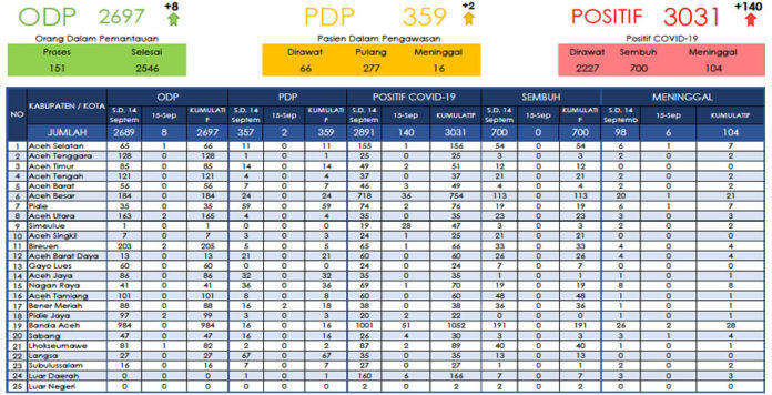 Analisaaceh.com, Banda Aceh | Pasien terpapar virus Covid-19 di Aceh terus bertambah. Bahkan hingga hari ini, Selasa (15/9/2020) tercatat 140 orang kembali terkonfirmasi Corona.