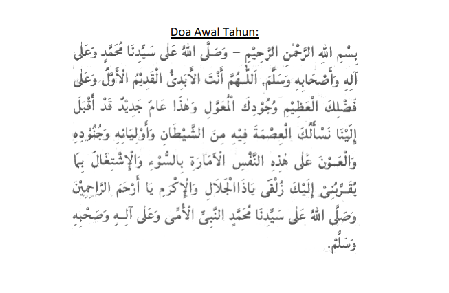 Wahai Tuhan, Engkaulah yang kekal abadi, yang qadim. yang awal dan ke atas kelebihanMu yang besar dan kemurahanMu yang melimpah dan ini adalah tahun baru yang telah muncul di hadapan kami. Kami memohon pemeliharaan dariMu di sepanjang tahun ini dari syaitan dan pembantu-pembantunya dan tentera-tenteranya dan juga pertolongan terhadap diri yang diperintahkan melakukan kejahatan dan usaha yang mendekatkanku kepadaMu Wahai Tuhan Yang Maha Agung dan Maha Mulia.