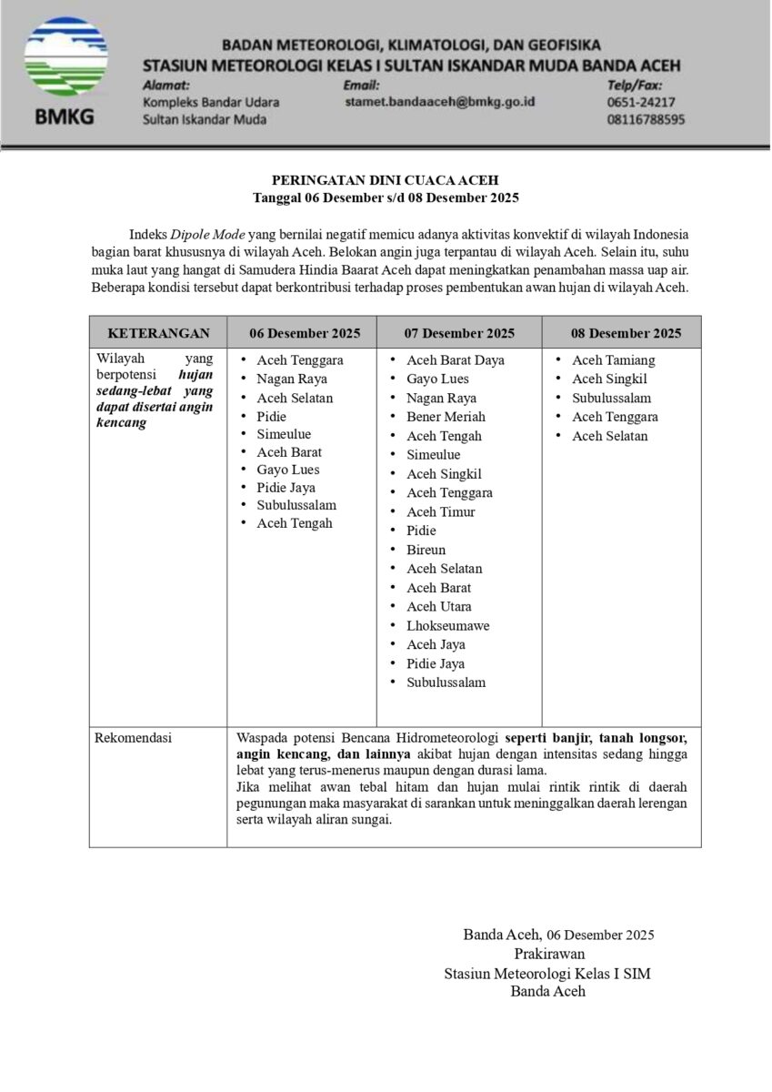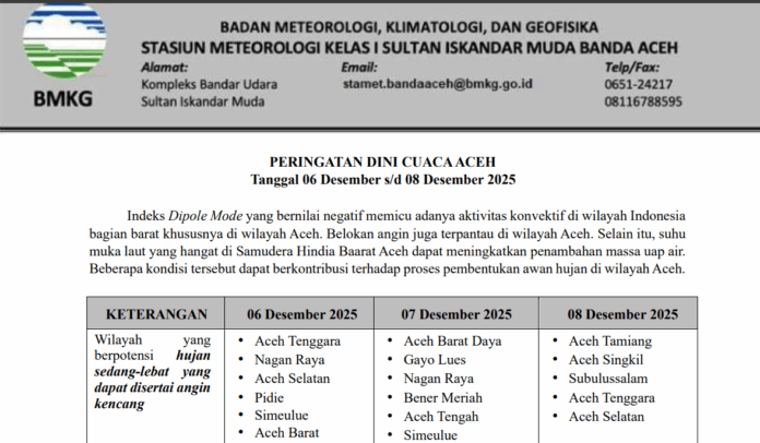 Peringatan Dini Cuaca Aceh dari BMKG yang berlaku 6–8 Desember 2025, memuat daftar wilayah berpotensi hujan sedang hingga lebat disertai angin kencang.