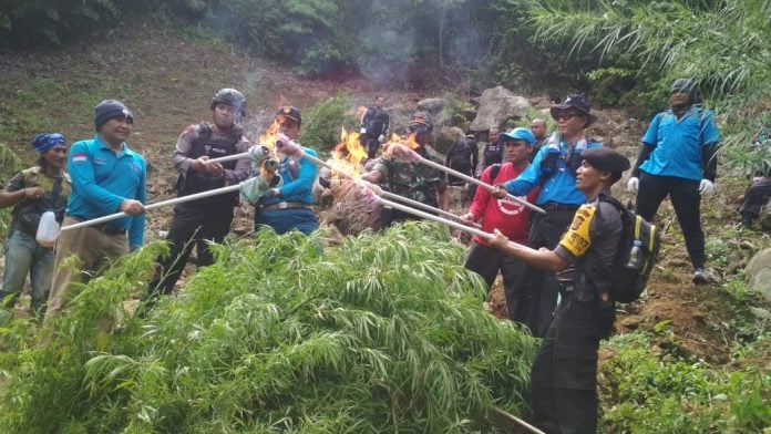 BNN bersama personil gabungan ketika melaksanakan pemusanahan ganja dengan cara dibakar. (Foto ; Istimewa)