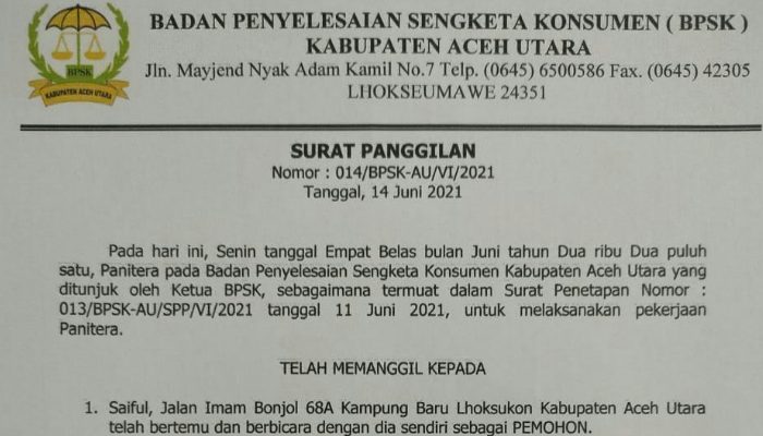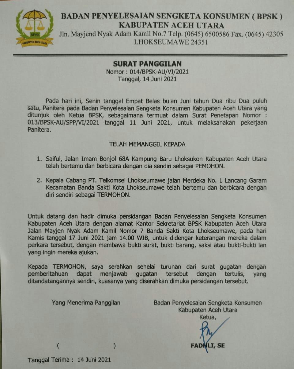 Analisaaceh.com, Lhokseumawe — Badan Penyelesaian Sengketa Konsumen (BPSK) Kabupaten Aceh Utara menyurati pimpinan Telkomsel Cabang Lhokseumawe untuk menghadiri sidang gugatan. Selain termohon, BPSK juga memanggil pemohon, Saiful sebagai pelanggan pengguna kartu halo.