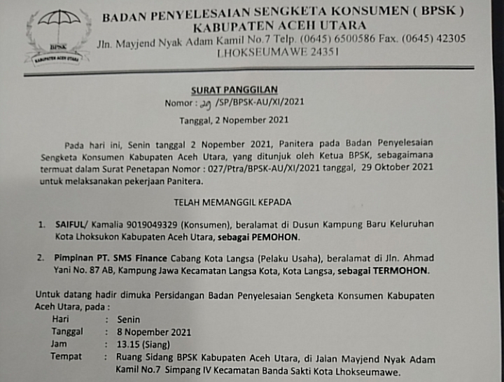Analisaaceh.com, Lhoksukon — Badan Penyelesaian Sengketa Konsumen (BPSK) Kabupaten Aceh Utara memanggil pelaku usaha yakni leasing SMS Finance Langsa. BPSK juga memanggil Saiful selaku konsumen untuk mengikuti sidang sengketa konsumen.