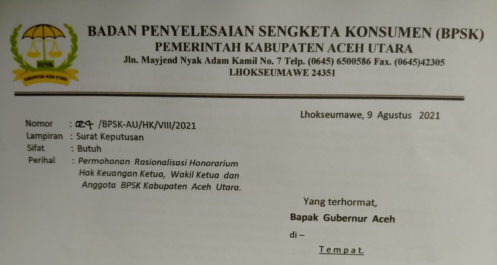 Analisaaceh.com, Lhoksukon — Badan Penyelesaian Sengketa Konsumen (BPSK) Kabupaten Aceh Utara menyurati Gubernur Aceh Ir Nova Iriansyah. BPSK menyampaikan permohonan penyesuaian honor komisioner BPSK, di tengah upaya mempertahankan kepercayaan pasar di masa pandemi Covid 19.
