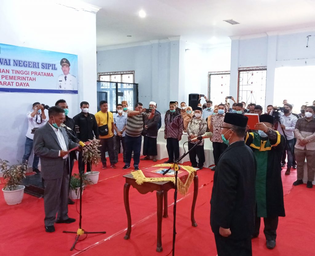 Bupati Aceh Barat Daya (Abdya), Akmal Ibrahim saat melantik Drs. Thamrin sebagai Sekda menjadi Staf Ahli bidang Keistimewaan, Sumber Daya Manusia dan Kerjasama, pada Kamis (7/10/2021). Foto: Ahlul