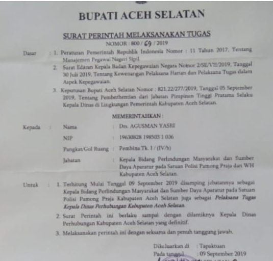 “Surat perintah ini berlaku sampai dengan dilantiknya Kepala Dinas Perhubungan Kabupaten Aceh Selatan yang defenitif,” demikian isi surat yang ditandatangani Bupati Aceh Selatan, Azwir.