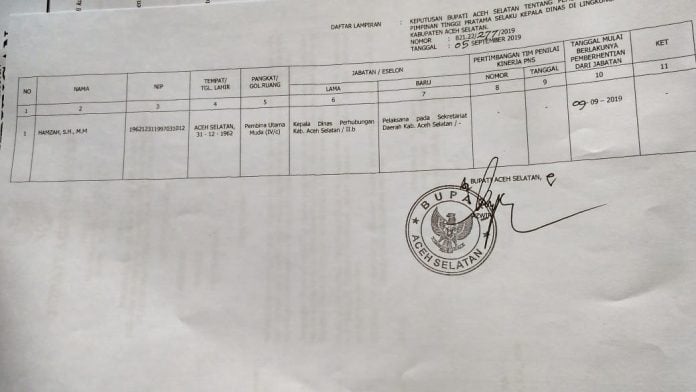 Koreksi : Berita ini sebelumnya berjudul “Bupati Aceh Selatan Copot Kadis Perhubungan”. Berdasarkan klarifikasi mantan Kadis Perhubungan, penggunaan kata Copot yang berkonotasi negatif atau seolah-olah wanprestasi tidak sesuai seperti yang beliau alami. Demikian, kesilapan telah dikoreksi (10/9). Terimakasih.