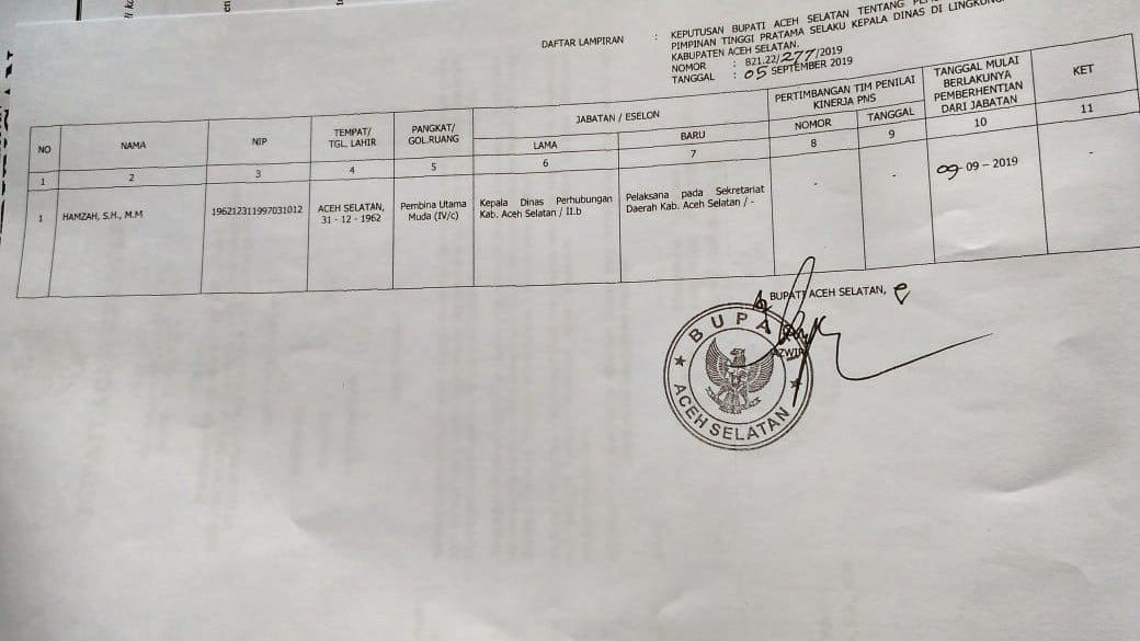 Berdasarkan SK tersebut, Bupati Aceh Selatan menunjuk Agusman Yaris sebagai pejabat pelaksana (Plt) Kadis Perhubungan yang sebelumnya dijabat oleh Hamzah. Selanjutnya Hamzah ditunjuk sebagai pelaksana pada Sekretariat Daerah Pemerintah Aceh Selatan.