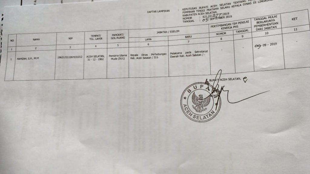 Analisaaceh.com, Tapaktuan | Bupati Aceh Selatan, Azwir mengganti Kepala Dinas Perhubungan Aceh Selatan berdasarkan Surat Keputusan Bupati bernomor 821.22/277/2019, 05 September 2019 tentang pemberhentian jabatan pimpinan tinggi pratama selaku Kepala Dinas di lingkungan Pemerintah Aceh Selatan.