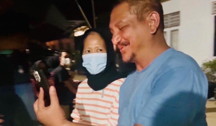 Ia tampak terharu, lalu segera mengarahkan layar ponsel kepada istrinya. Yuyun pun menyahut dengan mata berkaca-kaca, “Makasih, Pak.”