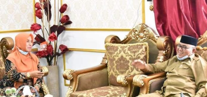 Bupati Simeulue H. Erli Hasim, SH., S.Ag., M.I.Kom saat menerima kunjungan kerja Kepala Dinas Pangan Aceh di pendopo Bupati pada Senin (26/10/2020).