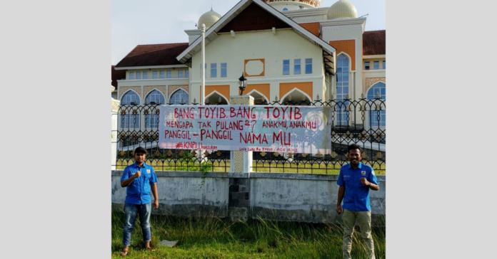 Penggalan lirik lagu tersebut yaitu “ _Bang Toyib, Bang Toyib Mengapa Tak Pulang – Pulang, anakmu-anakmu Panggil-panggil namamu”. Tertera juga pihak yang memasang spanduk tersebut yakni KNPI Kecamatan Lhoksukon.