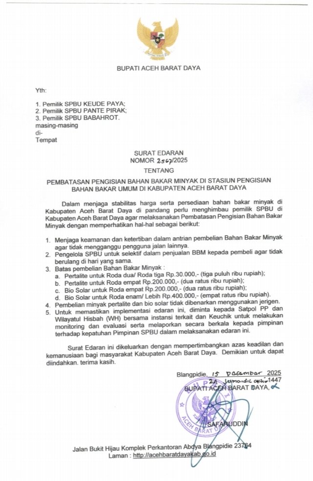 Dalam SE yang diperoleh Analisaaceh.com, Selasa (16/12/2025), Safaruddin mengimbau seluruh pemilik SPBU di Abdya agar menerapkan pembatasan pengisian BBM dengan tetap menjaga ketertiban umum.