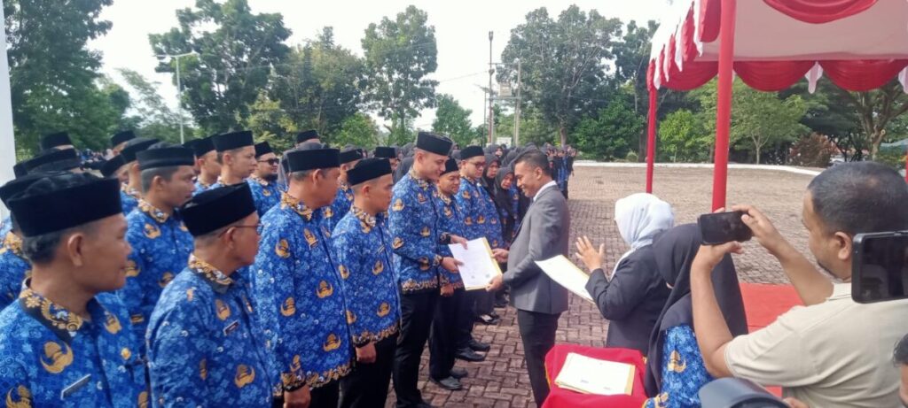 Bupati Abdya, Dr Safaruddin saat menyerahkan SK kepada PPPK dan PNS IPDN yang berlangsung di halaman kantor Bupati Abdya, Rabu (1/10/1/2025). Foto:Ahlul Zikri/Analisaaceh.com