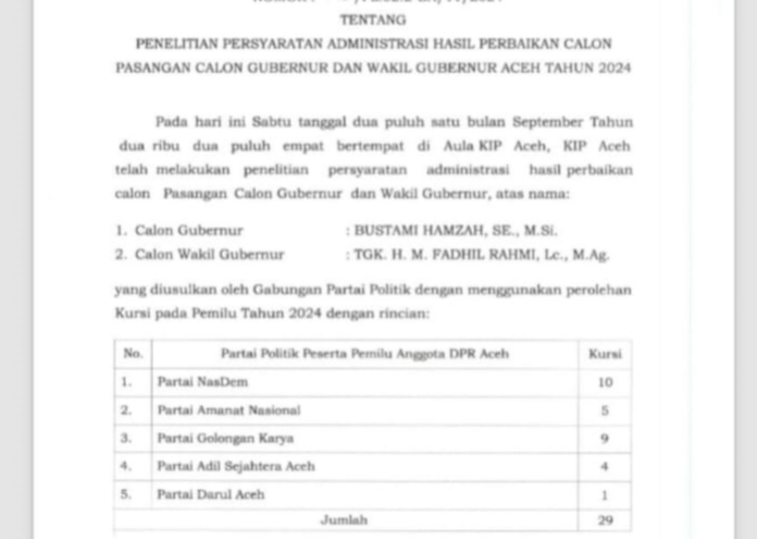 Keputusan ini tertuang dalam surat KIP tentang “Penelitian Persyaratan Administrasi Hasil Perbaikan Pasangan Calon Gubernur dan Wakil Gubernur Aceh Tahun 2024,” yang dijelaskan dalam Berita Acara KIP Aceh Nomor 210/PL.02.2-BA/11/2024. Penetapan dilakukan di aula KIP Aceh pada Sabtu (21/9/2024).
